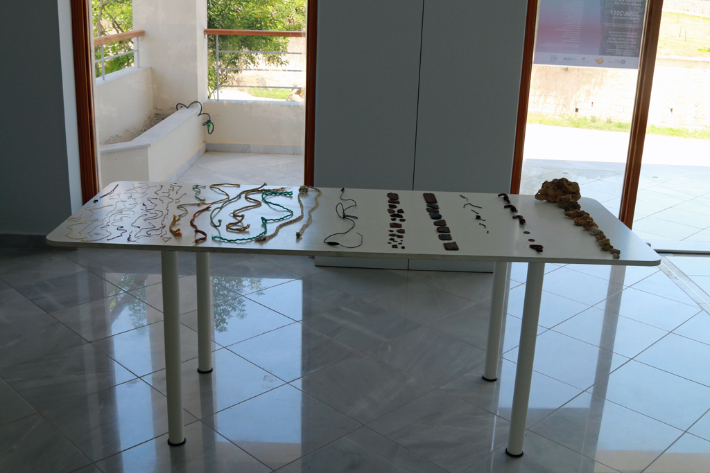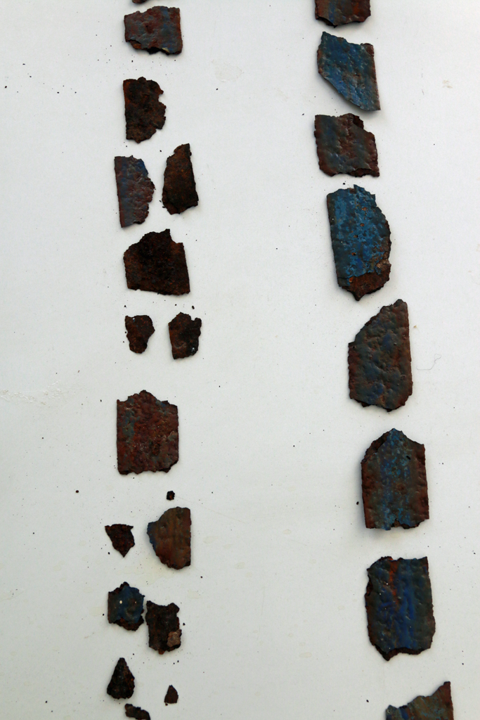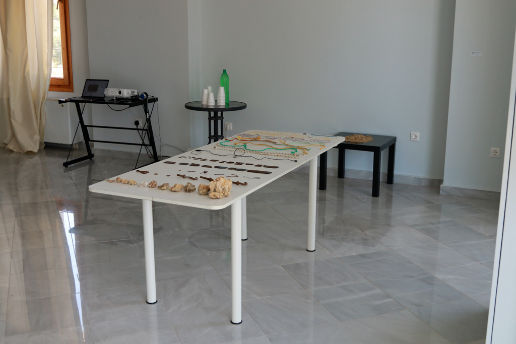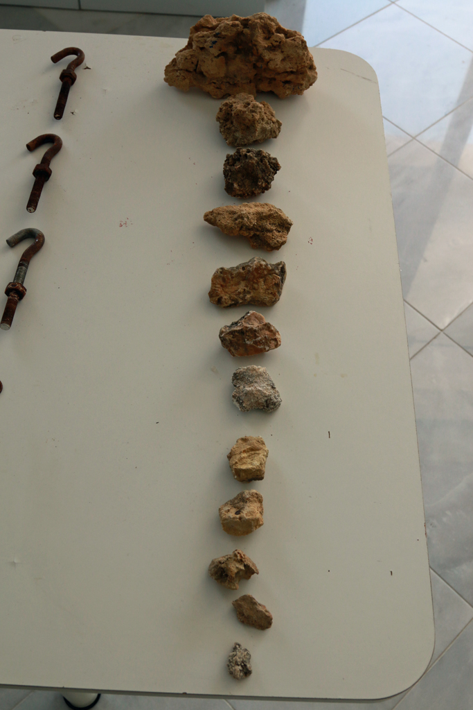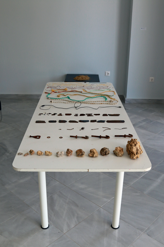 In this work I gathered objects, the sounds, the smell and taste that hold memory in that space. The video retraces the perimeter of the detainment house; the sounds evoke it and were made in empty metal boxes around the harbor. The objects gathered around the house’s perimeters are displayed archeologically, clinically as when we often do when trying to understand our past and distance ourselves from our emotions. The sawdust carries the smell of the harbor. In the bottle I have some water and salt that taste like seawater.