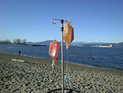 in the shape of car oil bottles and put them on an I.V. pole on a beach