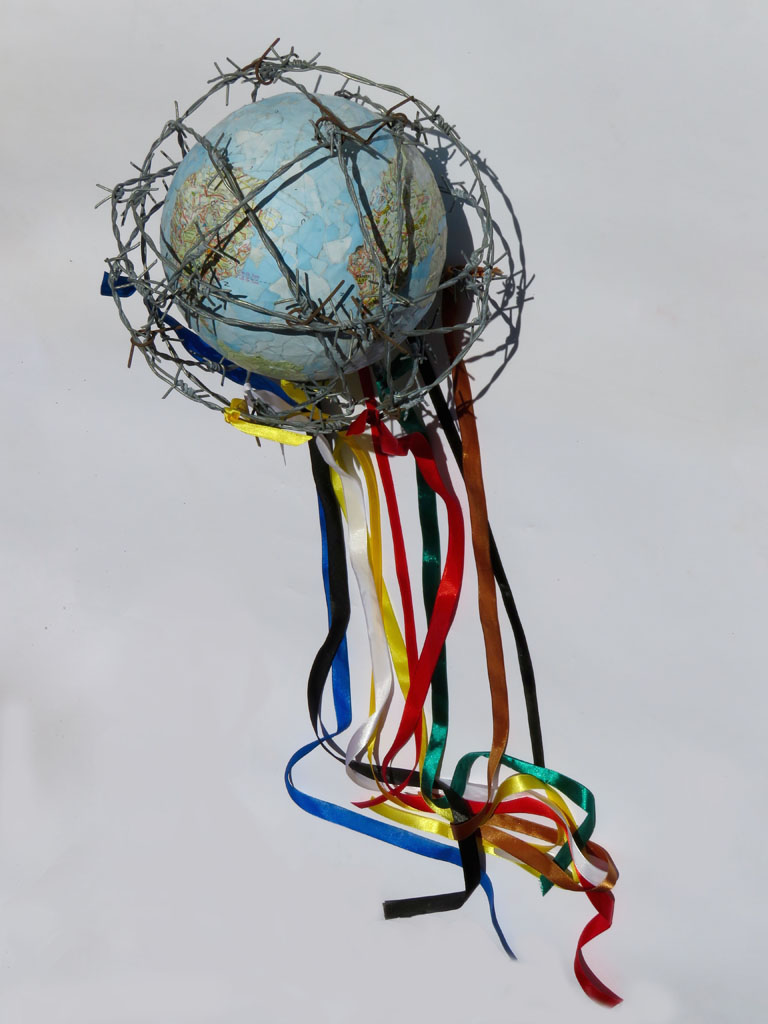 Lastly out of the pages of the world atlas I recreated a globe as it might look in 2216. I shrunk our land mass and covered it mostly with ocean. The globe is wrapped in barbed wire and ribbons hang from it arranged in a haphazard manner.