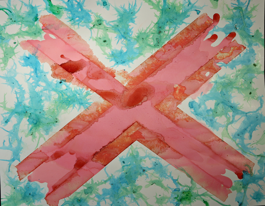 made by red wrigglers with blue and green non-toxic food colouring on paper with red acrylic cross with fungicide, 28in x 22in., 2019