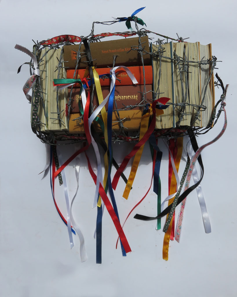Europe 2016 is composed of 9 European countries travel guidebooks transpierced and bound in barbed wire. Colorful ribbons matching their flag colors hang from the wire.