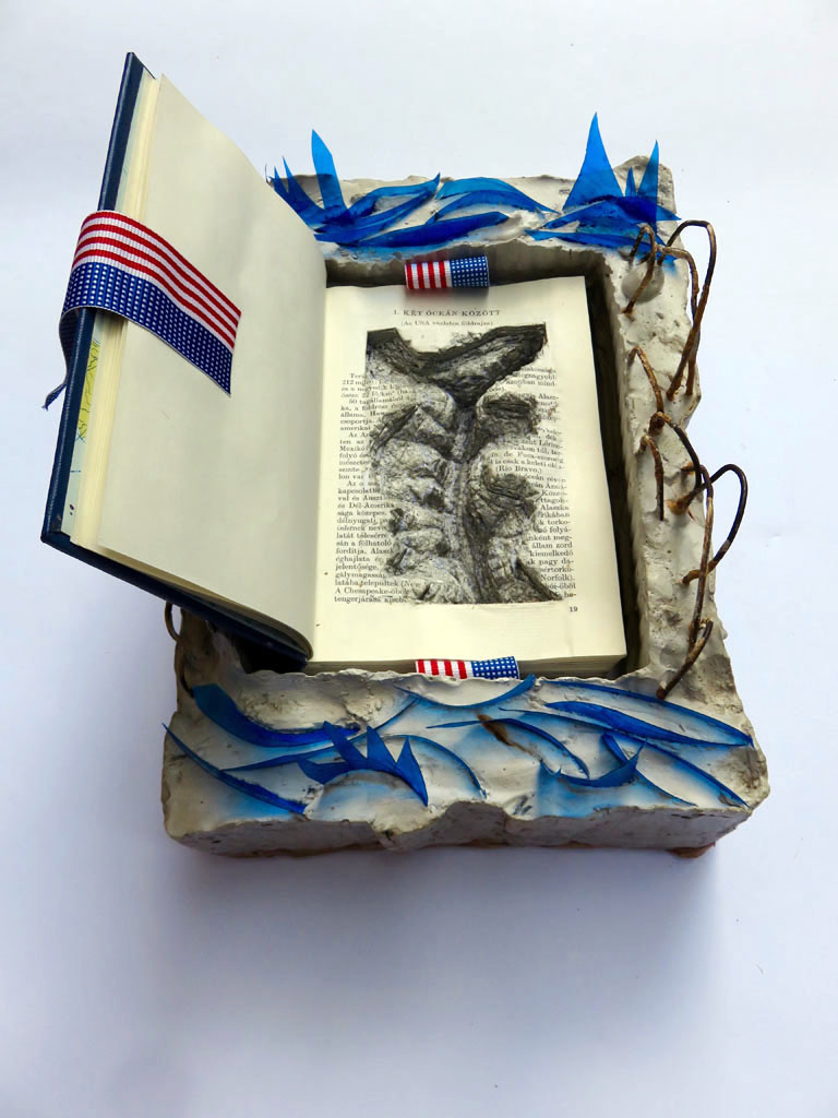 For Ket ocean kozott (between two oceans in Hungarian) I built an wall like enclosure for the travel guide book of the United States in which I carved out the Grand Canyon – the iconic great divide shaped by time and nature.